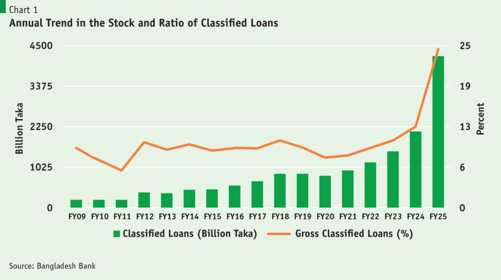 I have been writing about the danger of non-performing loans (NPLs) and the related threat to the stability of the banking sector since 2012. Some 13 years later the problem has escalated astronomically with little signs of reversal (Chart 1).  The problem was somewhat muted between FY2012-FY2020 but has gotten out of hand since then. The total value of NPL surged from a low of taka 227 billion in FY2012 to a peak of Taka 4203 billion in FY2025. In terms of share of the total loan portfolio, gross NPLs surged from 6% in FY2011 to 24% in FY2025.