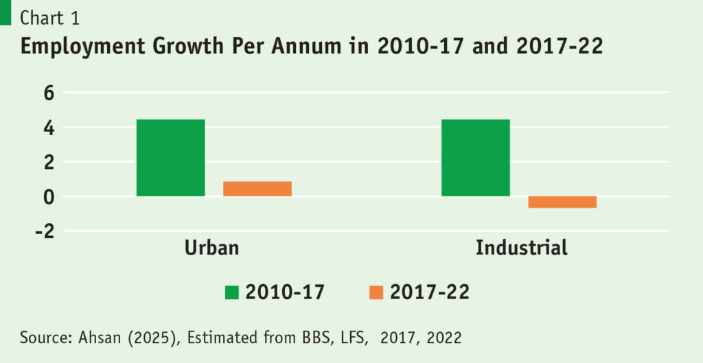 Moreover, these short-term economic instabilities have their roots in the lack of structural development and reforms in Bangladesh. Economic diversification has been limited, trade with the world as a share of GDP – a key indicator of competitiveness – has declined markedly and lags far behind neighboring competitor countries; both revenue collection and public investment in social sectors and infrastructure are woefully inadequate. Human capital development and, specifically, the quality of education and even health improvements are now stalling. The impact of these failures has been widespread – economic growth in FY 2025 at 3.7% has been the lowest since 1991, except in the Covid-affected FY 2020. However, more ominous and structurally challenging is the sharp drop in employment growth in 2017-22 in general and the absolute decline in industrial employment during the same period.