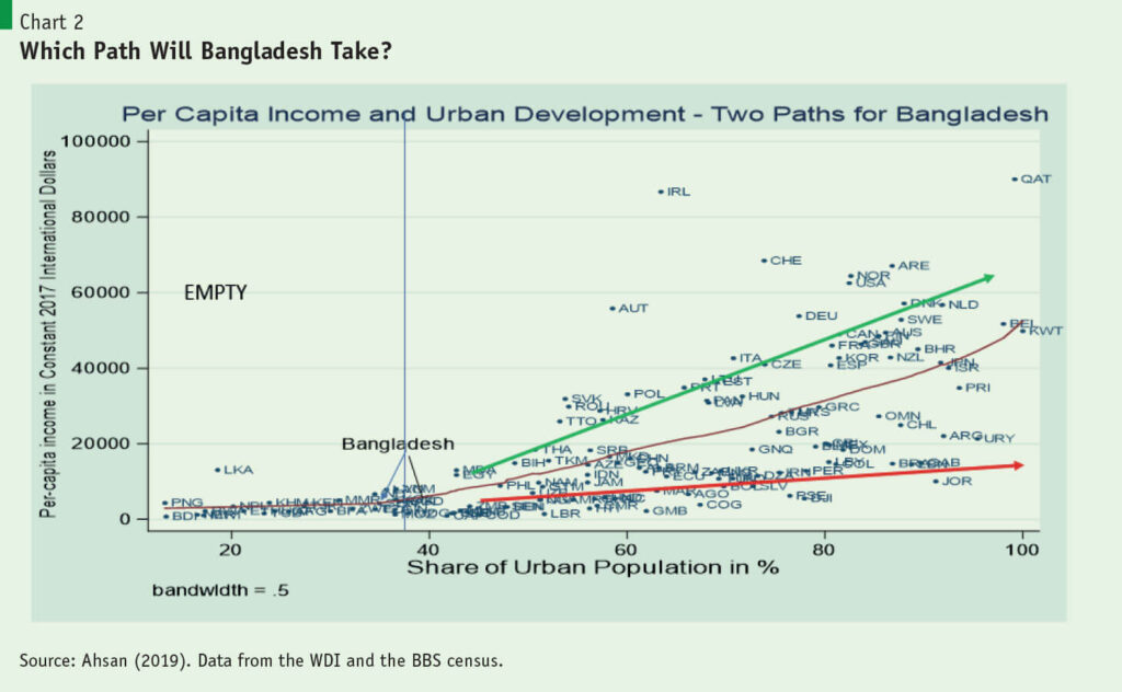 Bangladesh, with an urban population of 59 million (BBS estimate is 54 million, while UN DESA estimate is 69 million), roughly stands on the middle non-linear curve. The question for Bangladesh now is which part will it take? Will it move along the green line above the curve, or will it move along the red line below the curve?