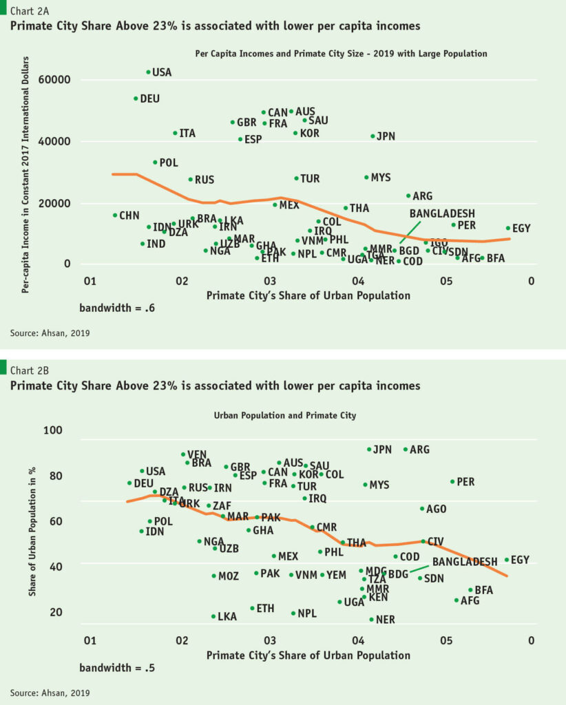 Empirically, the effect of excessive growth of large cities is well brought out in the case of primate cities – that is, the cities with the largest share of urban population in the country. International evidence and research (Ahsan (2019), Henderson (2000)) have suggested that there is an optimum threshold size of the primate city. When the share of the primate city population in total urban population crosses that threshold, approximately 23%, it starts to have an adverse impact on per capita income levels (Chart 2A) through its effects on adversely affecting overall urbanisation rates (Chart 2B, Ahsan, 2019). The mechanism is that due to the market and political economy failures mentioned above, it draws in disproportionately higher public and private resources to the primate city, away from other urban areas. The process is similar to the concept of Krugman’s “Externality Shadow” but extended nationally, where the primate city’s externalities affect overall urban development in Bangladesh (Fujita et al., 1999). It is also similar to the concept of the “parasitic” city (Hoselitz, 1955) as opposed to a “generative” city: i.e., a city that extracts more resources from its surrounding region and the country than the value it produces.