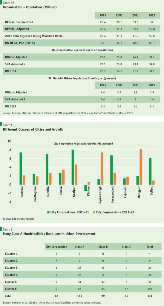 Second, there is good research suggesting that the urban population may be overestimated in some areas. An empirically rich paper classifies 331 towns and cities from the 2011 Census in Bangladesh based on data on five urban spatial features collected from remote sensing: city size (area), urban form (AWMPFD), the ratio of built-up and non-built-up areas, urban growth rate, and total night lights intensity (Rahman et al. 2018). Using these five urban spatial features, the paper classifies the municipalities’ urban development into six groups based on a clustering algorithm. The paper then establishes that urbanisation closely correlates with non-agricultural employment, per-capita income, and expenditures. Nearly 100 of the class A municipalities in the 2011 census, the most developed according to official definitions based on revenue collection, fell in the bottom two of the six clusters of urban development. That is, they are among the least urbanized by this classification (Chart 5 below). We found corroborating evidence to support this finding.