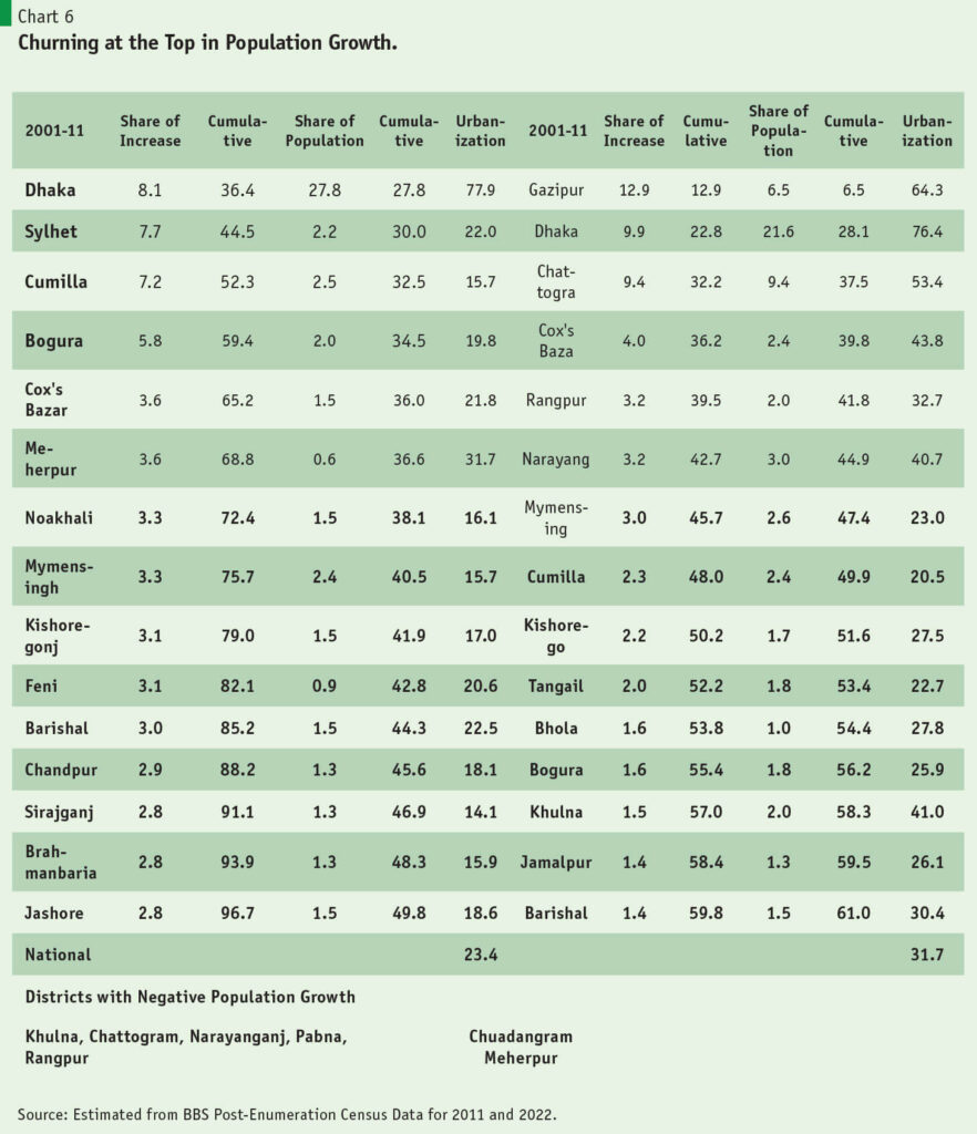 Although trends in the overall urban growth rate in the last decade are not entirely clear, the evidence suggests that there is churning in the ranks of districts by urban growth. Chart 6 below shows that seven of the top 15 fastest-growing urbanized districts in 2001-11 dropped out of that group in the next decade of 2011-22. These seven were Sylhet, Noakhali, Chandpur, Feni, Sirajganj, Jashore, and Brahmanbaria. They were replaced by Gazipur, Chattogram, Narayanganj, Tangail, Bhola, Khulna, and Jamalpur. Gazipur ranked at the very top by this indicator, accounting for almost 13% of the increase in the urban population.