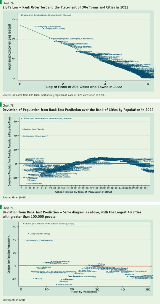 Interestingly, the estimation of this equation in the case of 304 cities and towns of Bangladesh from the 2022 census shows a remarkable consistency of its distribution as predicted by Zipf’s Law, as shown in Chart 6A below, with a regression correlation of 0.98. The β estimate of -0.9 is highly statistically significant. Moreover, it implies that the overall distribution of the urban population displays a sign of weak agglomeration.