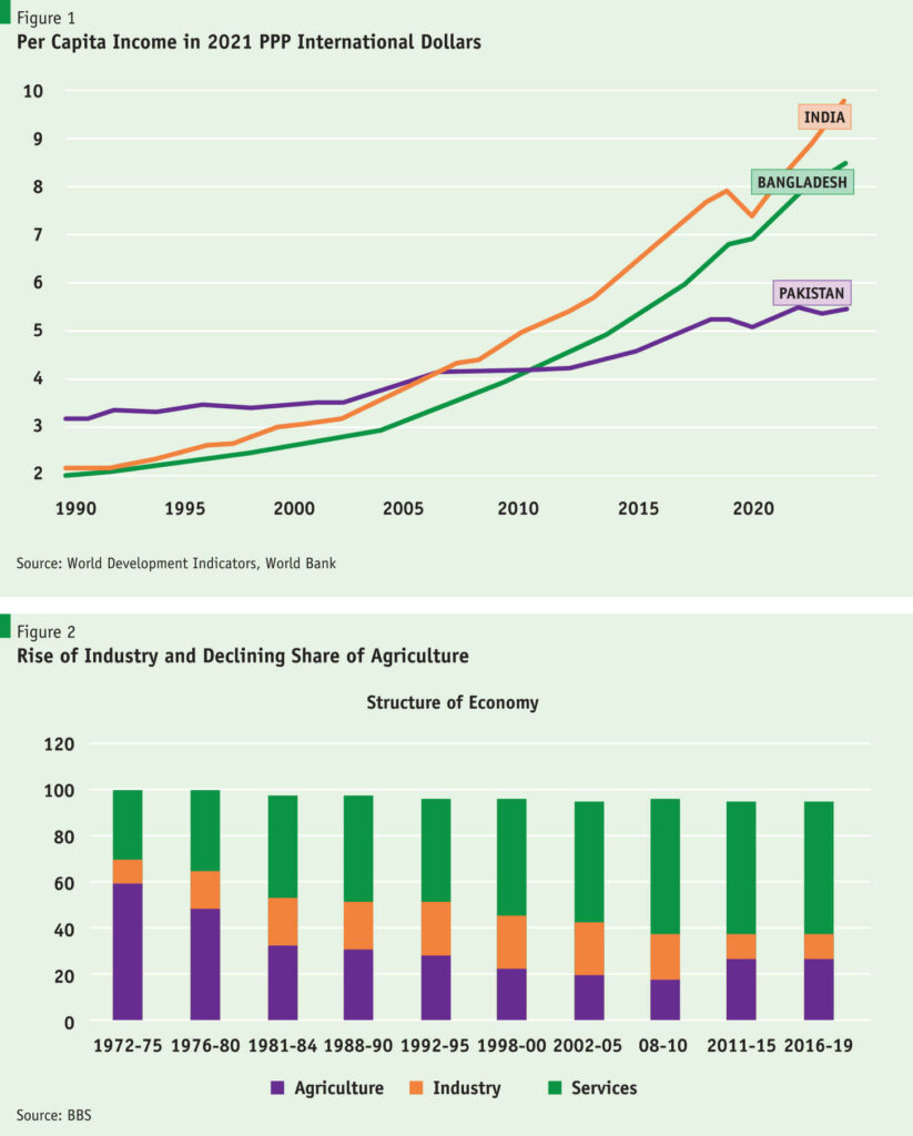 What made Kissinger identify Bangladesh as a possible candidate to succeed China? Clearly, Bangladesh is not in the same group as the East Asian “miracle growth” countries. However, in South Asia, Bangladesh’s development path aligns most closely with that of East Asia. Bangladesh’s growth has been driven by labor-intensive, export-oriented ready-made garment manufacturing and rapid increases in agricultural yields and production supported by investments in agriculture and rural development. Lastly, public expenditures in health and education developed human capital, albeit modestly.