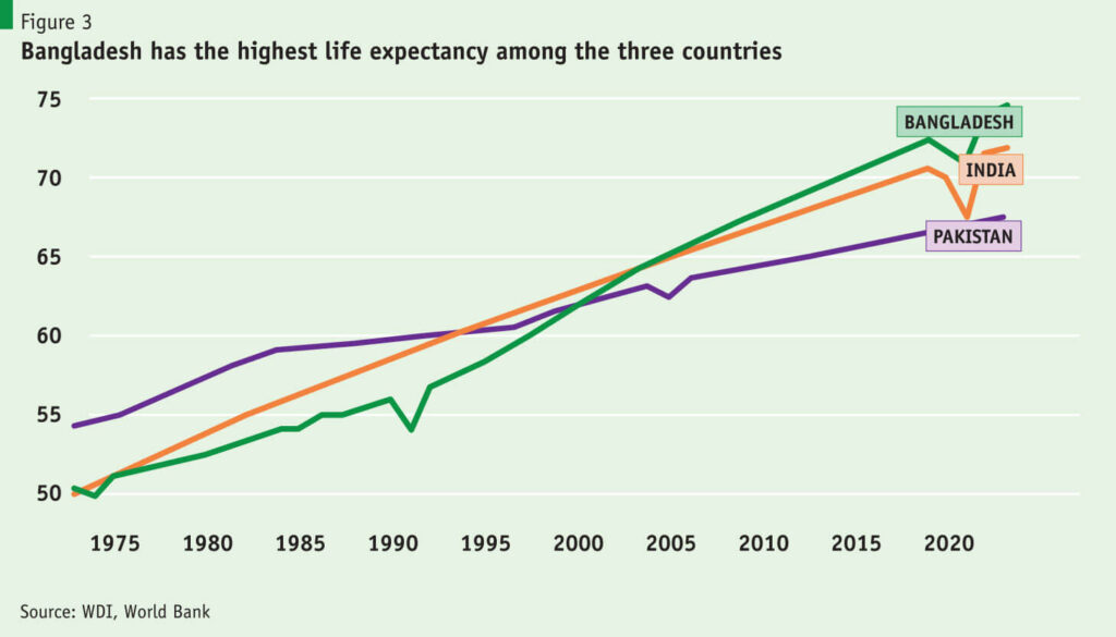 Finally, the most remarkable progress has been in health indicators, perhaps best summarized by Bangladesh’s life expectancy of 75 years, compared with 72 years in India and 68 years in Pakistan.