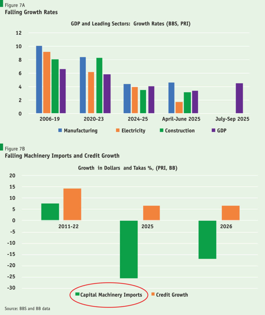 Declining growth rates have been particularly marked in the dynamic sectors of manufacturing and construction. Because construction accounts for 73% of investment in Bangladesh’s income accounts, its slowdown indicates that investment is stalling or even declining. Figure 7B supports this conjecture and shows a dramatic decrease in machinery imports in fiscal 2025 and the first quarter of fiscal 2026, compared with the average annual growth rate of 9% over the 12 years from 2011-22.