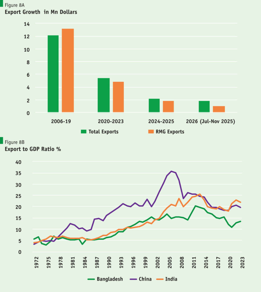 Structural weaknesses have led to a decline in Bangladesh’s economic competitiveness, as is darkly evident in Figure 8B. In Bangladesh, the export-to-GDP ratio declined from 20% in 2011 to 13% in 2023. It is also disturbing that Bangladesh’s export-to-GDP ratio is much lower than the 20 per cent-plus export-to-GDP ratios of China and India, which are much larger economies.
