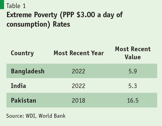 The rise in incomes and structural transformation led to a marked decline in poverty. The upper poverty line (monthly expenditures of Tk. 15,328 for a family of four) poverty rate fell from 60% in 1985 to 18% in 2022, while the extreme poverty rate (monthly expenditures of Tk. 11,000 a month for a family of four) declined from 40% to 6% over the same period. Worth noting in Table 1 is that in 2022, Bangladesh’s poverty rate had declined to nearly the same level as India’s and was markedly lower than Pakistan’s 16% poverty rate (in 2018).