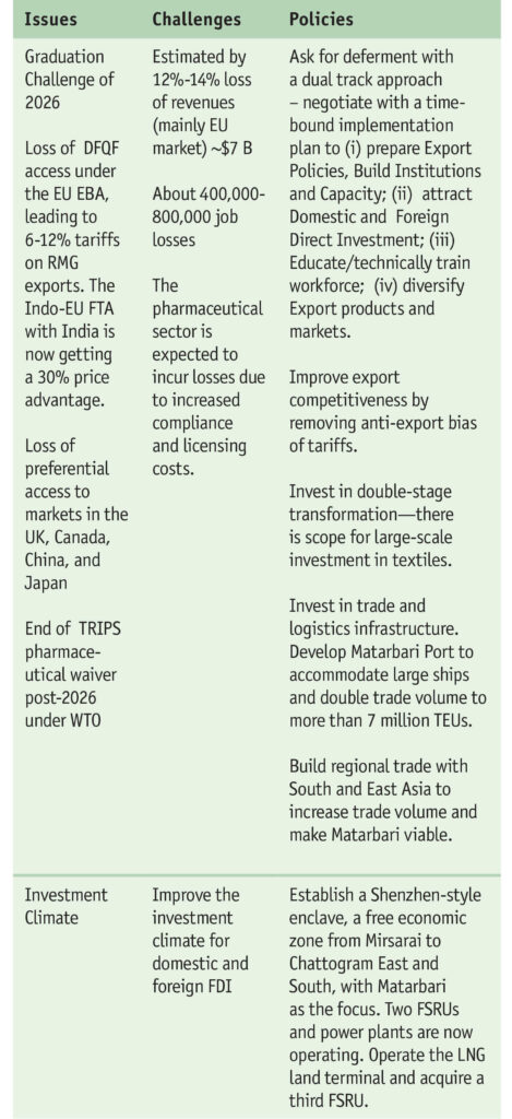 Third, the restoration of a democratically elected government provides renewed prospects of reinvigorating development. It sketches out seven specific agenda items that the new government will need to address to achieve that: (i) meeting the employment crisis through a productive works program; (ii) focused investment and trade policies that will meet the LDC graduation challenge and employ millions by making the economy competitive and boosting labor-intensive diversified exports; (iii) solving the ongoing energy/gas crisis and implementing a medium term plan to provide energy and power sustainably; (iv) raising revenues to provide much needed public services while increasing expenditure effectiveness; (v) deepening financial sector reforms; and (vi) policy- institutional reforms and investments in education and health to build up human capital.