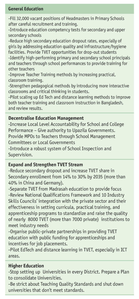 Thus, while resources have been allocated to school and college infrastructure, teacher recruitment and training have been neglected. Nearly a quarter of primary school teachers lack training. The teacher-training curricula lack adequate practical classroom training. Most astounding is that nearly half the country’s government primary schools, some 32,000 schools, are without Head Masters. Research worldwide and in Bangladesh makes it clear that a good headmaster is the principal determinant of a school’s educational outcomes.