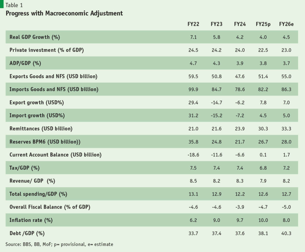 Significant progress has been made in stabilizing the macroeconomy (Table 1). The current account of the balance of payments has turned around from a large negative number to positive, reserve run down has been arrested and a modest recovery of reserves is now underway. The upward trend in inflation has been contained with a modest slowdown in inflation. On the other side, the quality of the macroeconomic adjustment has been weak. Private investment rate has fallen significantly. Public ADP spending has been cut sharply. GDP growth has continued to slide, falling to a low of 4% in FY2025.