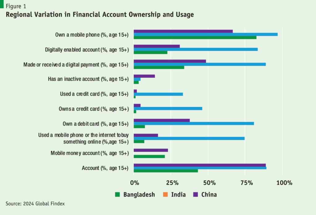 However, accomplishments on other notable avenues of the cashless space have been far limited. Bangladesh’s experience with QR-Code based transactions is far less impressive than countries such as Cambodia, Vietnam, India or China. Moreover, recent data underline both progress and enduring gaps. The 2024 Global Findex data for Bangladesh shows that only 43% of adults (age 15+) have a financial account, whether through a bank, another financial institution, or mobile money, indicating that a majority of the population remains outside the formal financial system. While 21% of adults hold a mobile money account and 23% have a digitally enabled account, nearly half the adult population remains outside the formal financial system altogether. Card ownership is particularly low: just 8% of adults have a debit card and only 2% a credit card, limiting the growth of card-based payments. By comparison, China and India project a much more impressive performance, demonstrating what is possible when infrastructure, regulation, and consumer trust align.